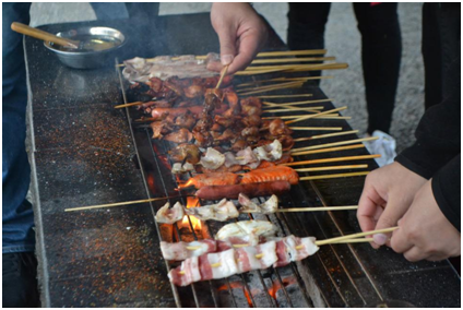 In this sunny afternoon, we had a barbecue together, sharing food, including sausages, chicken wings, pork belly, etc. All shashliks emit appetizing scent. Some people roasted; some ate; and some commented. All of us enjoyed ourselves.